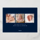 Elegant foil birth announcement featuring "Our New Love" displayed in a gold foil script overlay with rose gold foil hearts on each side. Personalise the gold foil birth announcement with a horizontal newborn photo, the baby's name, and birth stats. The announcement reverses to display 3 additional photos and text with a solid navy background. The 4 photo birth announcement is perfect to use as a Valentine's day birth announcement!
