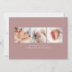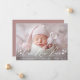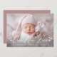 Elegant photo birth announcement featuring "Our New Love" displayed in a white script overlay with hearts on each side. Personalise the simple birth announcement with a horizontal newborn photo, the baby's name, and birth stats. The announcement reverses to display 3 additional photos and text with a solid dark mauve background. The 4 photo birth announcement is perfect to use as a Valentine's day birth announcement!