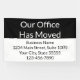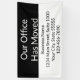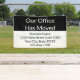 Our Office Has Moved is in white text at the top. The bottom has black display text you can edit to show your company's name, new address, and phone number. All text can be edited or deleted.