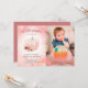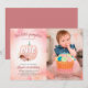 This sweet 1st birthday party invitation features a vertical photo and is accented with a pumpkin and watercolor flowers and rose gold glitter. This design is perfect for a fall birthday celebration.