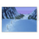 A 3D fantasy landscape full of shimmering snow and magical fairy lights. A row of silvery shining lamps lights the trail through a snowy mountain pass hemmed in by steep rocky cliffs. The sparkling snow-covered path is hemmed in by dark fir trees.