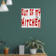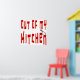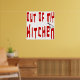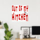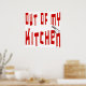 Out of My Kitchen Funny Saying in red letters with a meat cleaver in the letter n.