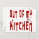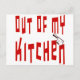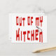 Out of my Kitchen saying for cooks with an attitude, moms with Momitude and those slaving over a hot stove everywhere. Fun food slogan in blood red scratchy letters with a meat cleaver in the 'N'