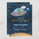Cool space "Out of This World" theme kid's birthday party invitation featuring a watercolor celestial background of planets and stars, a cute alien astronaut flashing the peace sign inside a spaceship with "I come in peace" caption.