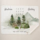 Outdoor adventure themed growth tracker blanket for twins with a watercolor illustration of a family of deer, mountains, pine trees and a tent. Document your babies’ milestones with this outdoorsy mountain campsite design.
