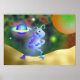 A cute cartoon alien monster from another world creeping along the sandy planet. Illustration of a science fiction fantasy landscape designed on to a poster print.