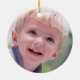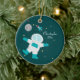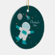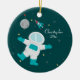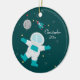 This cute boy's personalized round ceramic photo ornament has an out of this world space theme! The background has a dark teal color with lots of yellow, white, and grey stars in the background. There is an astronaut on the bottom with a gray moon with a star flag at the top. There is a rocket ship floating to the right of the moon. On the right, you can easily customize the name and the year. On the backside, you can easily add your own photograph.