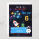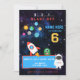 Blast off with this cosmic design featuring an outer space astronaut theme! Dive into a black galaxy backdrop sprinkled with rocket ships, aliens, and planets. Customise it with your event details to make it uniquely yours! Available as printable invitations and instant downloads.