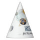 Celebrate your child's special milestone with these magical outer space themed party hats. Featuring imaginary planets, moon and stars in navy and gold colorway. These Outer Space Birthday Galaxy Sun Moon Stars and Planets Party Hats are perfect for a simple birthday party. The modern whimsical design showcases a navy-blue watercolor background adorned with a yellow vibrant sun, smiling grey moon, pastel-coloured planets, and gold scattered glow stars.