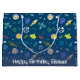 Cute, outer space, colourful marker doodles made into a pattern on dark blue background. Planet, spacecraft, rocket ship, satelites, and alien aircrafts in this dark blue galaxy design. A monogram greeting template at the bottom edge on both sides is created for you.
