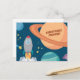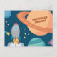 Postcard with a fun outer space design with planets, rocket, and stars. It has text saying Greetings Friend but can be personalised.