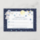 Outer space Baby Name Suggestions with blue stars on midnight blue background. Each card has a spaceman, spacecraft and pale yellow moon on white background. Enclose in the envelope with matching invitations.