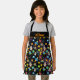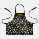 A colourful outer space Apron for a little boy's Nursery or bedroom with their name in an orange text surrounded by astronauts, rockets, aliens stars and planets all on a black milky-way photographic background. Personalise by amending the child's name. Great to give as a gift for birthdays to your grandchild or family member.