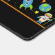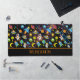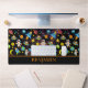 A fun colourful Outer space desk mat. Design features fun cartoon astronauts, rockets, aliens. stars, moon and planets all on a black milky-way photographic background. Personalise by amending the name. A perfect way to add colour and fun to a child's desk.