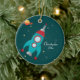 This cute boy's personalized round ceramic photo ornament has an out of this world space theme! The background has a dark teal color with lots of yellow, white, and grey stars in the background. There is a spaceship on the bottom with an orange and red planet with rings around it at the top. On the right, you can easily customize the name and the year. On the backside, you can add your own photograph.