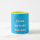 "THINK OUTSIDE THE BOX" 11oz Combo Mug. To think outside the box is to look further and to try not thinking of the obvious things, but to try thinking of the things beyond them or even other than them. It is a metaphor that means to think differently, unconventionally, or from a new perspective. This phrase often refers to novel or creative thinking. (Wikipedia)