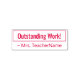 This encouraging rubber stamp design features the encouraging message "Outstanding Work!" and a personalised teacher's name. It could be used by a school teacher, educator, instructor, or tutor when grading student work, to indicate that a student has done an exceptional job.