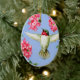 Oval shaped ornament with a painting of a hummingbird and pink flowers on a blue background. Lovely for Mother's Day or Christmas.