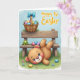 At the center of the card is a round-faced, bunny-like creature with soft brown fur, lying on its back near the bottom of the scene with curled paws, big blue eyes, and rosy cheeks that read like a shy, affectionate blush 🐰. Behind it, a rustic wooden bench supports a woven basket tied with a periwinkle-blue bow, and the two seem paired like friendly companions in the same little spring moment. The basket overflows with pastel oval eggs in pink, blue, yellow, and purple, each decorated with small patterns that add a gentle, festive rhythm. A small bright-green frog with curious eyes sits on the bench as if keeping watch, adding a quiet hint of friendship to the setting. The foreground is grassy and dewy with tiny wildflowers and a few scattered eggs, suggesting recent exploring and shared discoveries 🐇. In the upper right, the text reads “Happy 1st Easter” in a clear, dark-colored font that stands out against the pale sky. Soft light washes the scene from above, turning the sky a calm, powdery blue and leaving the bench’s wood grain and the basket’s weave lightly detailed. The periwinkle bow loops neatly over the basket rim, with one ribbon tail draping toward the eggs.