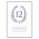 Elegant oval wreath leaf in dark navy blue on white wedding table number card. Edit this card with your own names and wedding details and table number. You must change the number to each table number that you need and add them to your cart, one at a time. Quantity discounts may apply once you add all the items to your cart. Other matching items are available. Designed by www.mylittleedenweddings.com