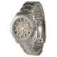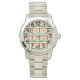 This women's watch has a mid-century modern design of ovals and circles in orange, gold, teal, and turquoise on a field of white. Want the same design with different colours? Message me.