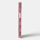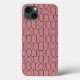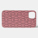 This phone case has an art deco design of pink ovals, rectangles, and circles in grey horizontal lines repeating in rows.