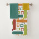 This towel set has a gold washcloth, a teal hand towel, and a bath towel with a mid-century modern design of ovals and circles in orange, gold, teal, brick, green, and berry on a field of white. Want the same design with different colours? Message me.