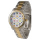This men's watch has a mid-century modern design of repeating rectangles and ovals in flower garden colors.