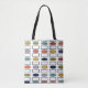 This tote bag has a mid-century modern design of repeating rectangles and ovals in retro colours.