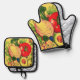 BRIGHT COLORED VEGETABLES ART ON POTHOLDER AND OVEN MITT. LOTS OF RED AND GREEN TO BRING CHEER TO OUR KIT CHEN.