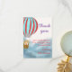 Baby showers thank you card features cute cub on a hot air ballon flying over the clouds.
