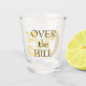 Over the hill shot glass. Include his, or her, age behind the "over the hill" wording. Text is dark brown-black with orange shadow. The numbers are light grey outlined in orange-yellow.