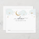 Baby shower activity card features watercolor blue clouds and gold stars. Advice" card prompts guests to share advice for the parents to be as they prepare for baby.