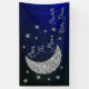 Over the moon baby shower with silver moon and stars against a black and blue night sky background