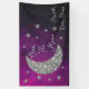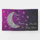Over the moon baby shower with silver moon and starts against a black and pink purple night sky background