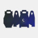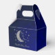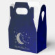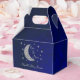 Over the moon baby shower with silver moon and stars against a black and blue night sky background