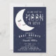 Adorable baby boy over the moon in love baby shower invitation. Flip our baby shower invite over to view a coordinating back with blue stars.