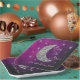 Over the moon baby shower with silver moon and stars against a black and pink purple night sky background