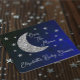 Over the moon baby shower with silver moon and stars against a black and blue night sky background