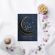 A sweet Over the Moon coed baby boy shower invitation featuring a watercolor illustration of a crescent moon mobile over a deep navy blue watercolor background, with gold foil on the moon and the moon mobile. Perfect for future parents who love the over the moon theme, the moon and the stars and celestial themes.