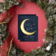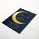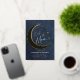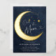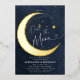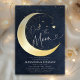 A sweet Over the Moon coed baby boy shower invitation featuring a watercolor illustration of a crescent moon mobile over a deep navy blue watercolor background, with gold foil on the moon and the moon mobile. Perfect for future parents who love the over the moon theme, the moon and the stars and celestial themes.
