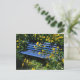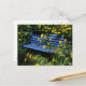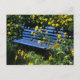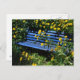 overgrown blue bench postcard