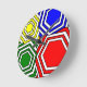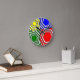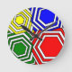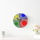 This clock has a Bauhaus design of overlapping concentric hexagons in red, yellow, blue, and green.
