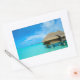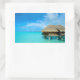 Rectangular souvenir photo sticker of a honeymoon overwater bungalow in a luxury resort in the clear blue lagoon of the pacific island of Bora Bora, near Tahiti in the French Polynesia archipelago.