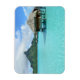 Rectangular souvenir photo magnet with a luxury overwater bungalow resort in the clear blue lagoon of the pacific island of Bora Bora, near Tahiti in French Polynesia.