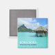 Square souvenir fridge magnet of a luxury honeymoon overwater bungalow resort in the clear blue lagoon of the pacific island of Bora Bora, near Tahiti in French Polynesia with the text: 'BORA BORA, French Polynesia'. A great souvenir!