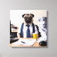 A pug dog in a business suit sits at a desk surrounded by a large stack of paperwork.