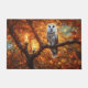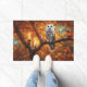 A beautiful owl sits with a background of fall coloured leaves with candles. A mystical outdoors wildlife pretty doormat.