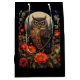 Gift bag with a cool looking owl with a piercing stare. A full moon in the back with a garden of red flowers.