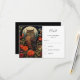 An RSVP card with a cool looking owl with a piercing stare. A full moon in the back with a garden of red flowers.